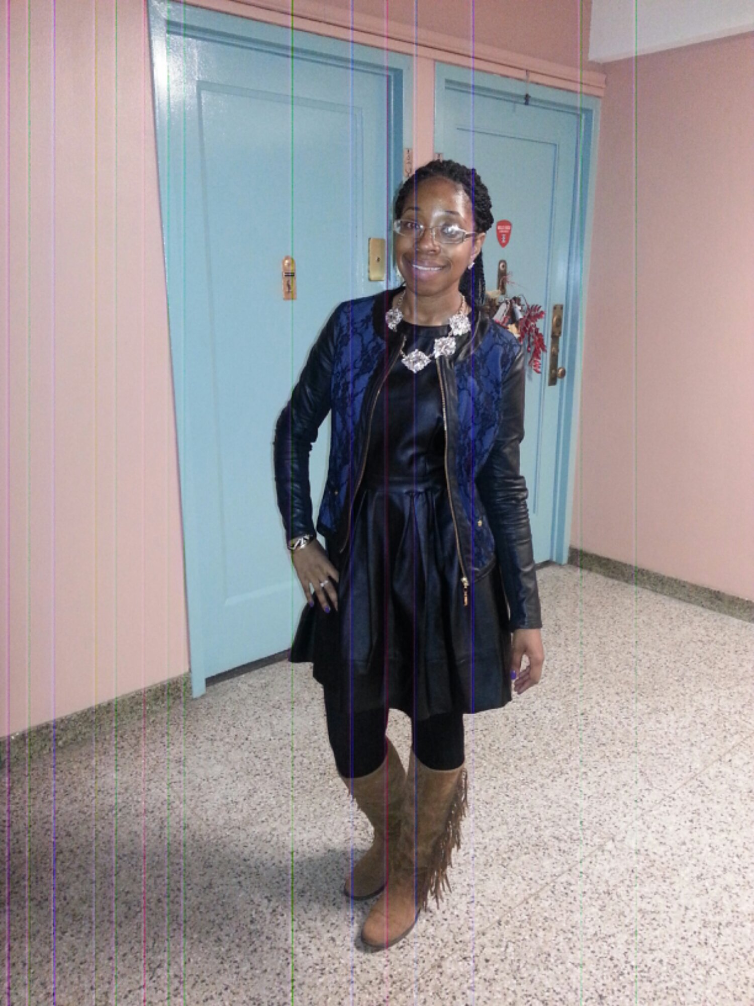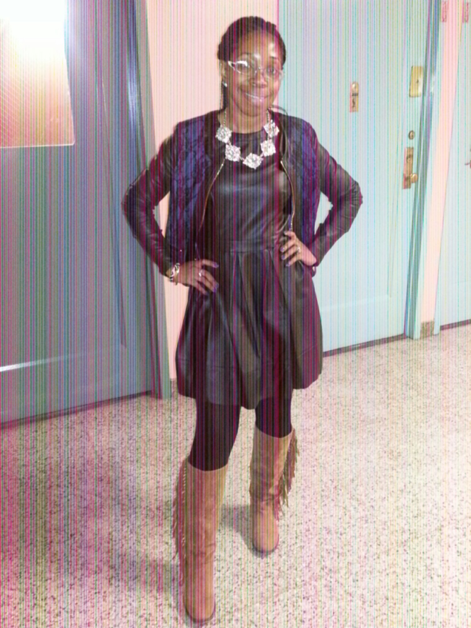 I decided to pair it with this lace and leather style jacket love the denim detail to it. The statement necklace was only $6 from my local nyandcompany store. I love these suede fringe boots I felt the color brought out the extra pop in the outfit. This was a great work and after work outfit for a person on the go who does not have time.