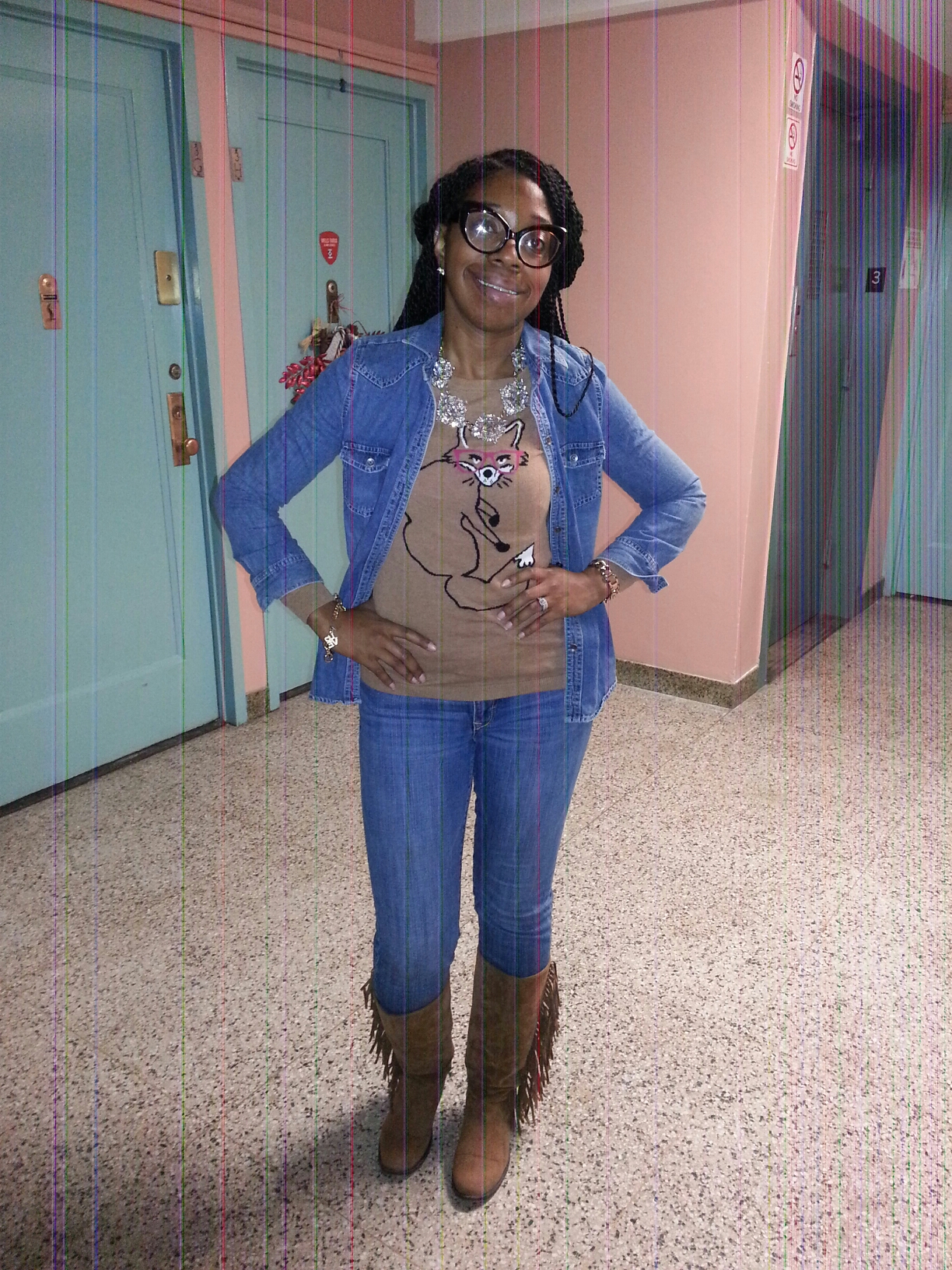 The whole outfit was from oldnavy. I adore this Fox sweater that i wore before with a blazer and made it dressy so this casual way was cute. Paired it with my fringed boots and was on my way. This is also a great weekend look without trying too much. Hope you enjoy this look and have a great week.