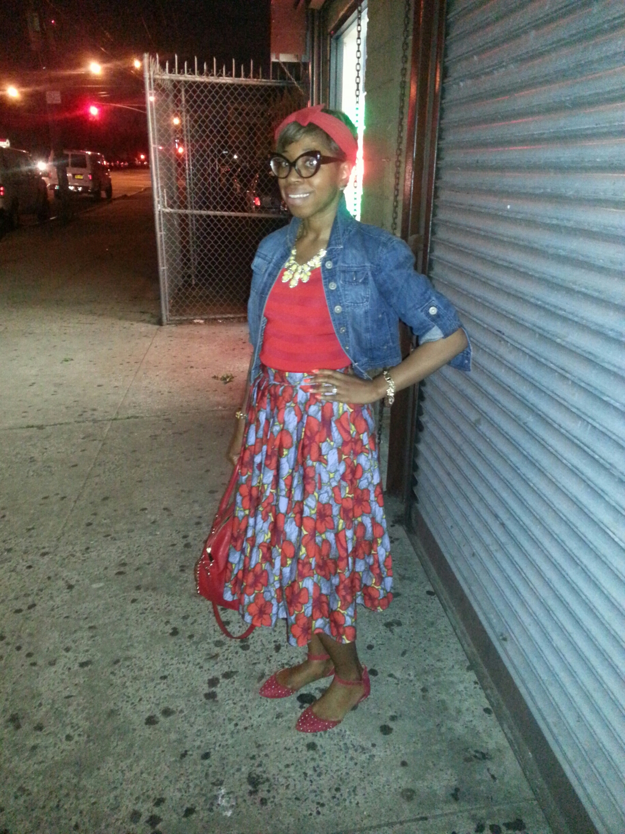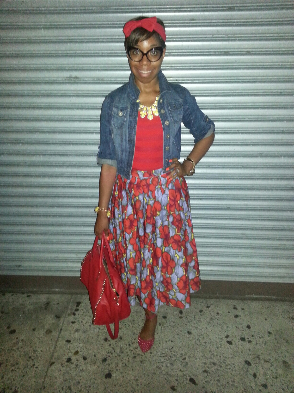 I paired it with my red peplum top from express from last summer and had it tucked in. I wore it with my studded flats and wore bright yellow jewlery to bring out that part of the skirt.