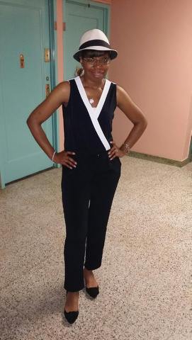 When I do not want to wear a dress or skirt to work I usually opt for the pants jumper. I love this one from one of my favorite stores. New York and company. I love the all black with hint of white by collar and the fit was a Taylor fit.