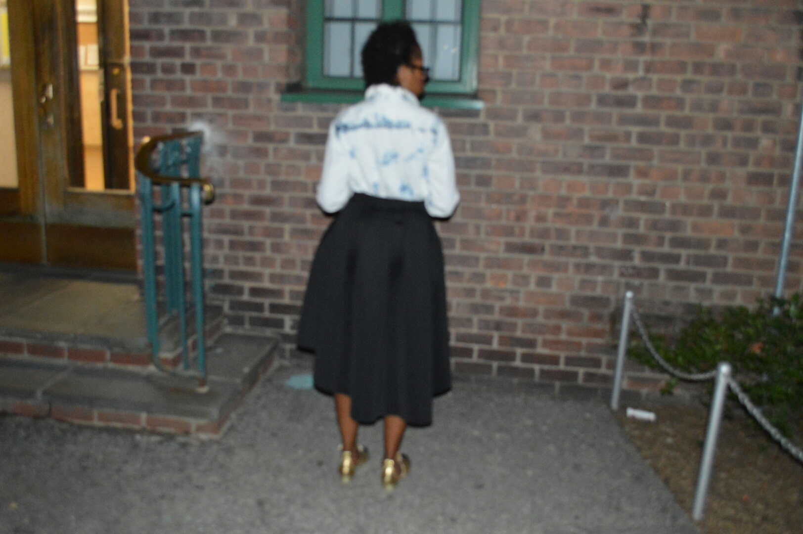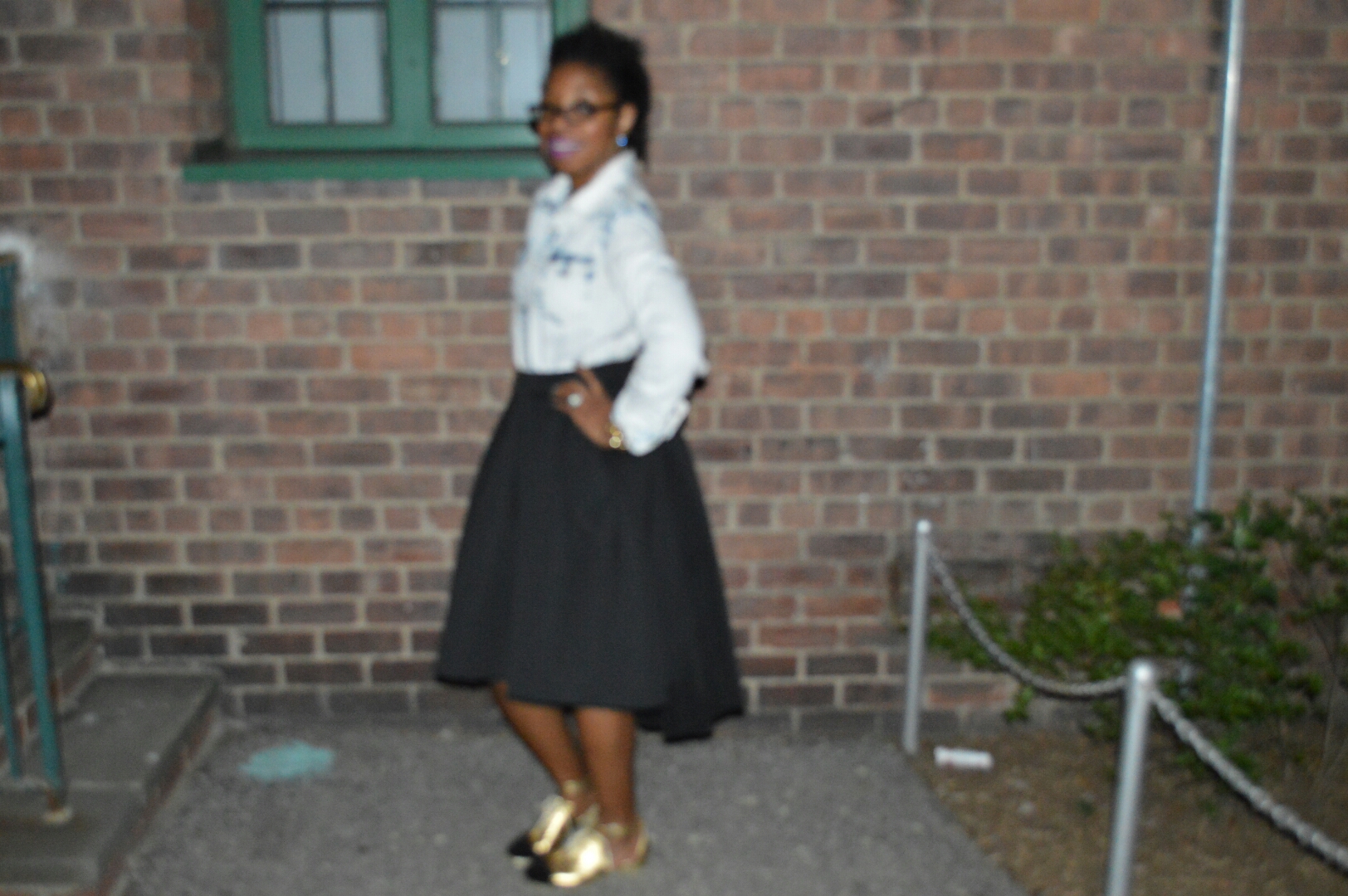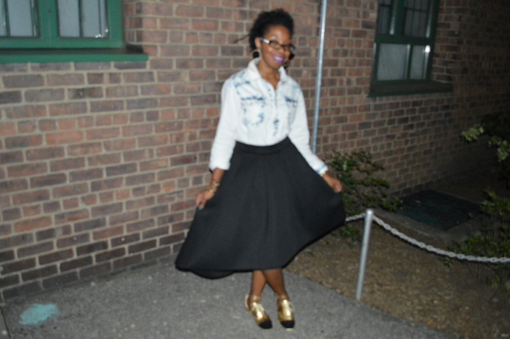This flair metallic gold and black designed skirt i love as it gave me a vintage feel and vibe. I wanted to dress it down by wearing it with a denim button down shirt. I paired it with some black boots and my black motor jacket for the extra touch.