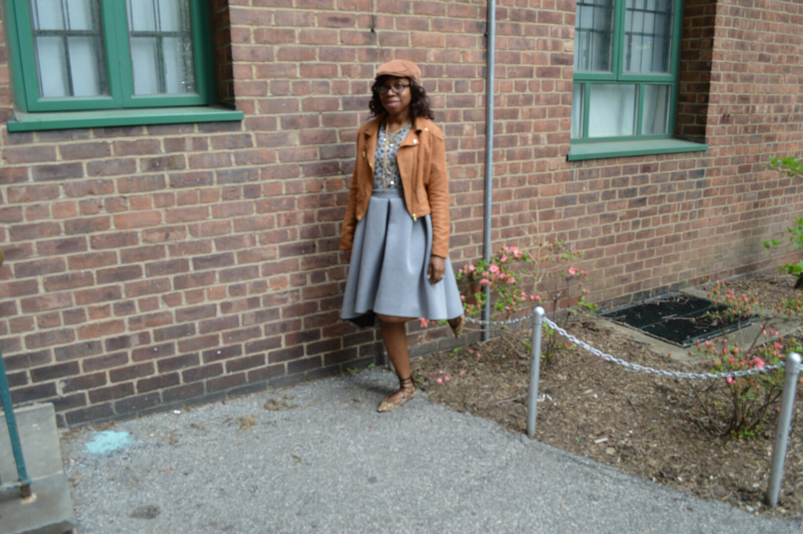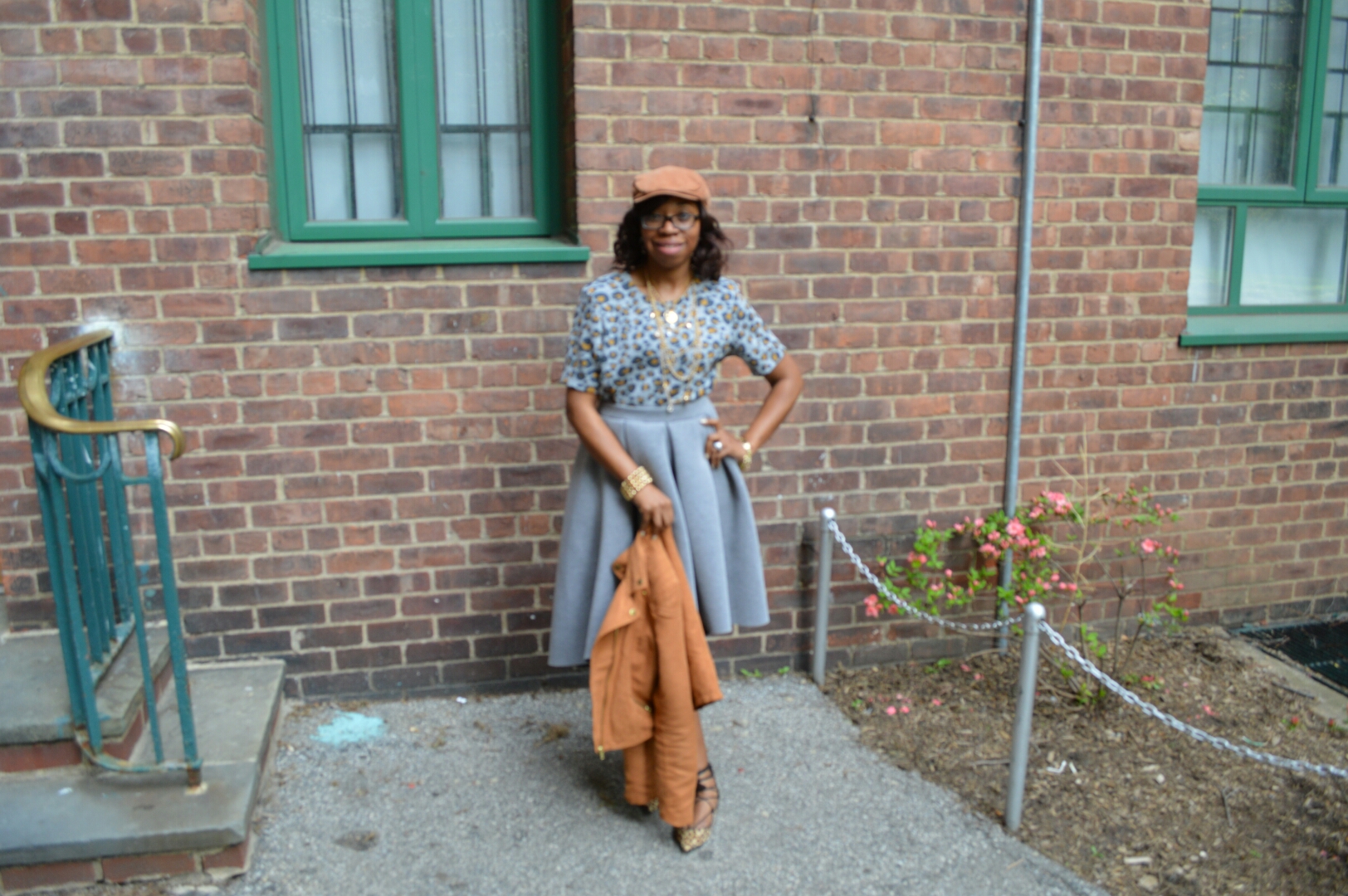 Now on to the look :). Gray is like the new black in many ways as it goes well with some many colors believe it or not. I paired one of my favorite midi skirts with this nice leopard print top that I purchased from h and m last year. Paired it with a cute suede moto jacket and leopard flats and the look was perfect.