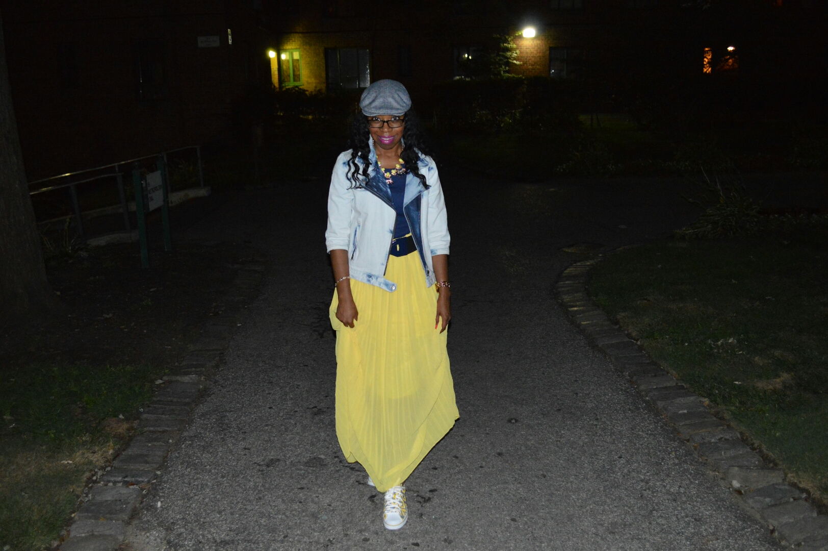 accessories, blog, denim jacket, Fashionblogger, fashionista, jewelry, maxi skirt, statement necklace, style blogger, yellow