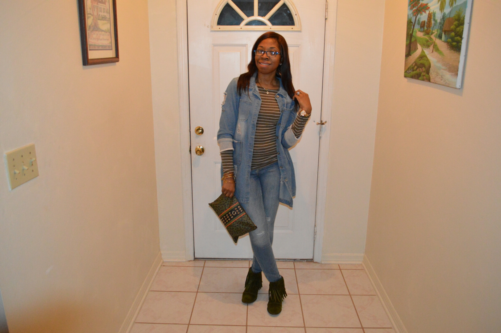 I paired some boyfriend jeans with a striped shirt and oversize denim thrifted jacket. The fringe boots were the extra touch. This look was perfect for the double date I had with hubby and a good friend of mine from high school. I was comfortable and cute.