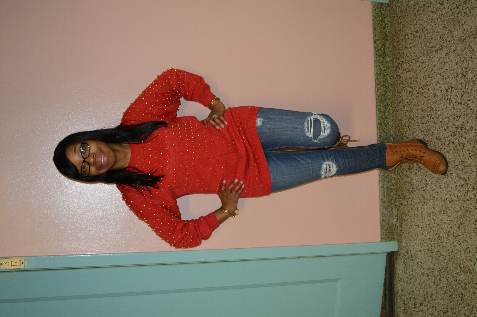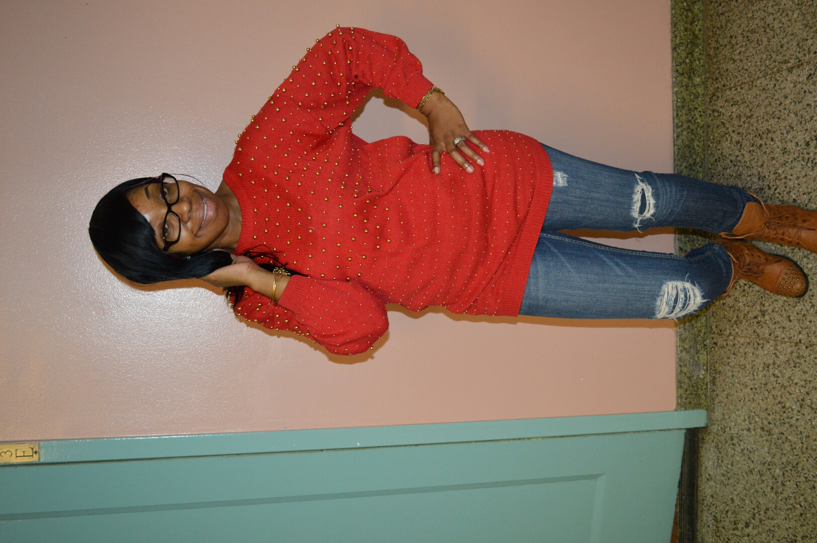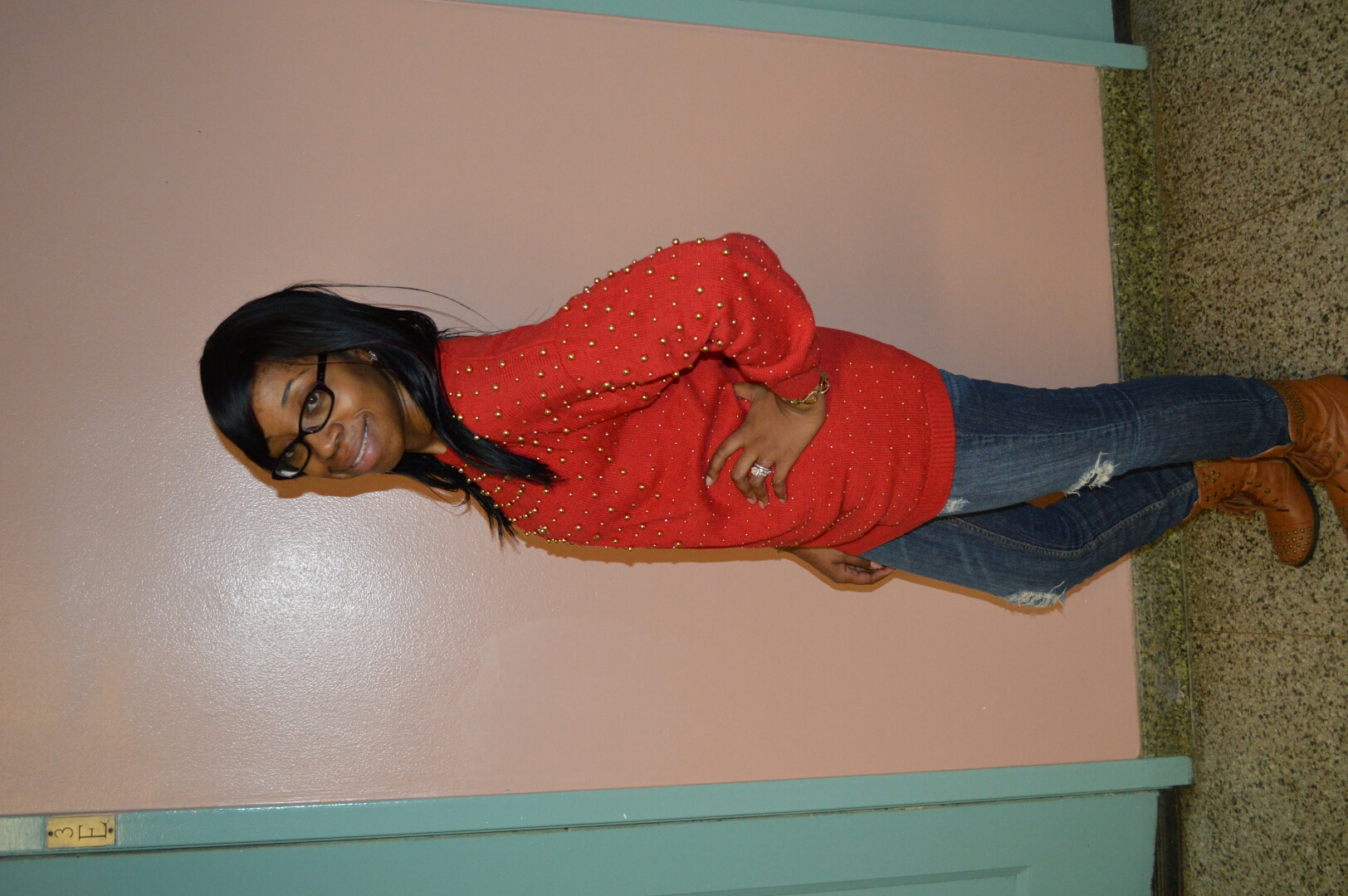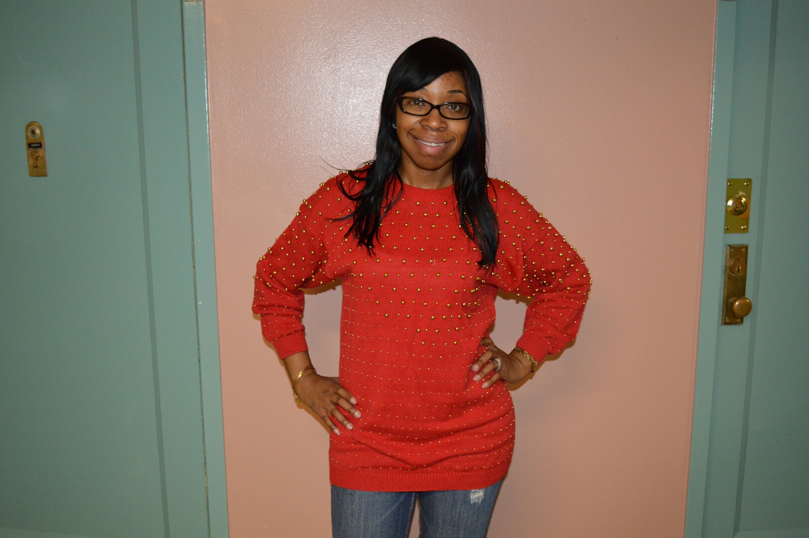 I love thrifted finds especially when they are sweaters. I love sweaters and this one was no exception. I purchased this one early last year from goodwill for only 4 dollars. I love the gold beading on the sweater as it makes the red stand out.